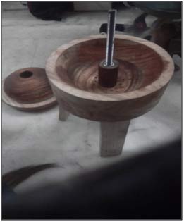 After seeing & do practically the process, we can decide the prototype for squeezing the powder & the oil is taken out from it. The local villagers can use it easily. This device is mostly made up with wood and in middle the lead screw is of stainless steel. So by rotating the upper male portion of the wood block, it come down and squeeze the bag of steamed powder of Mahua.