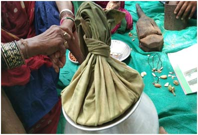 On first day, in Khuntgaon, we met GawadeMaharaj, who is well known for his treatment for paralysis and crams. He also told about many other traditional practices for natural medicines. In the same village, BaburaoMesojiPada told about herbal practices to prevent paddy from diseases like maavatudtuda. In Mendhatola, we met Shilpa Shankar Gedam, who had made arty-craft from old saaris. In Usheerpur, we met two school going students, Ankush and Gauraw, who made three models of machines which can be used to give water to road when road is constructed. That was an exceptional example of understanding problems around us and arriving at a solution shown by just 8-9 yrs boys. On second day at Rekhatola, during village meeting, Anita Usandi, introduced us to Mahua powder and Laddu! In next village , we met state level wrestling champion JayshriKargami. We all were stunned after knowing about her. In the same village we collected traditional seeds of rice spices. In Pustola village we met a very youngest Sarpanch, RanjanaPustola. She was just 24 yrs old successfully running a village! On third day, in the village called Yedampayali, while exchanging seeds we discovered new variety for beans made by DashrathHichami.